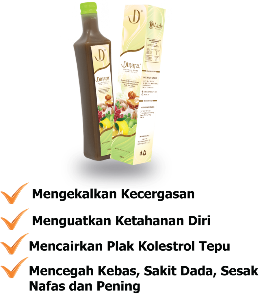 Jus Dinara mengandungi : Herba Temulawak, Halia Bara, Madu, Delima, Lemon, dan bahan bahan semulajadi lain yang kaya dengan khasiat dalam melawan kolesterol jahat serta sekaligus dapat mengawal Kolesterol ke tahap normal.